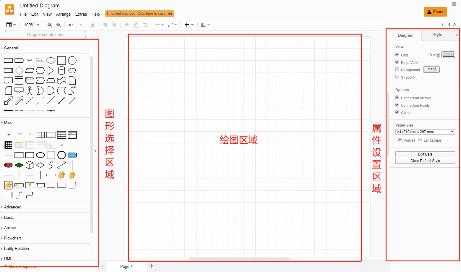 既然要认识它,那就先来看看它长什么样子,它主要分为三个区域,从左往右的顺序是「图形选择区域、绘图区域、属性设置区域」。