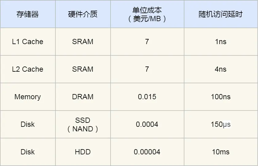 在价格上,每生成 MB 大小的 L1 Cache 相比内存贵了 466 倍,相比机械硬盘那更是贵了 175000 倍。