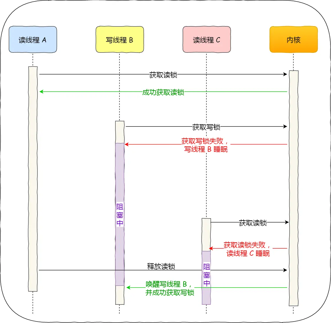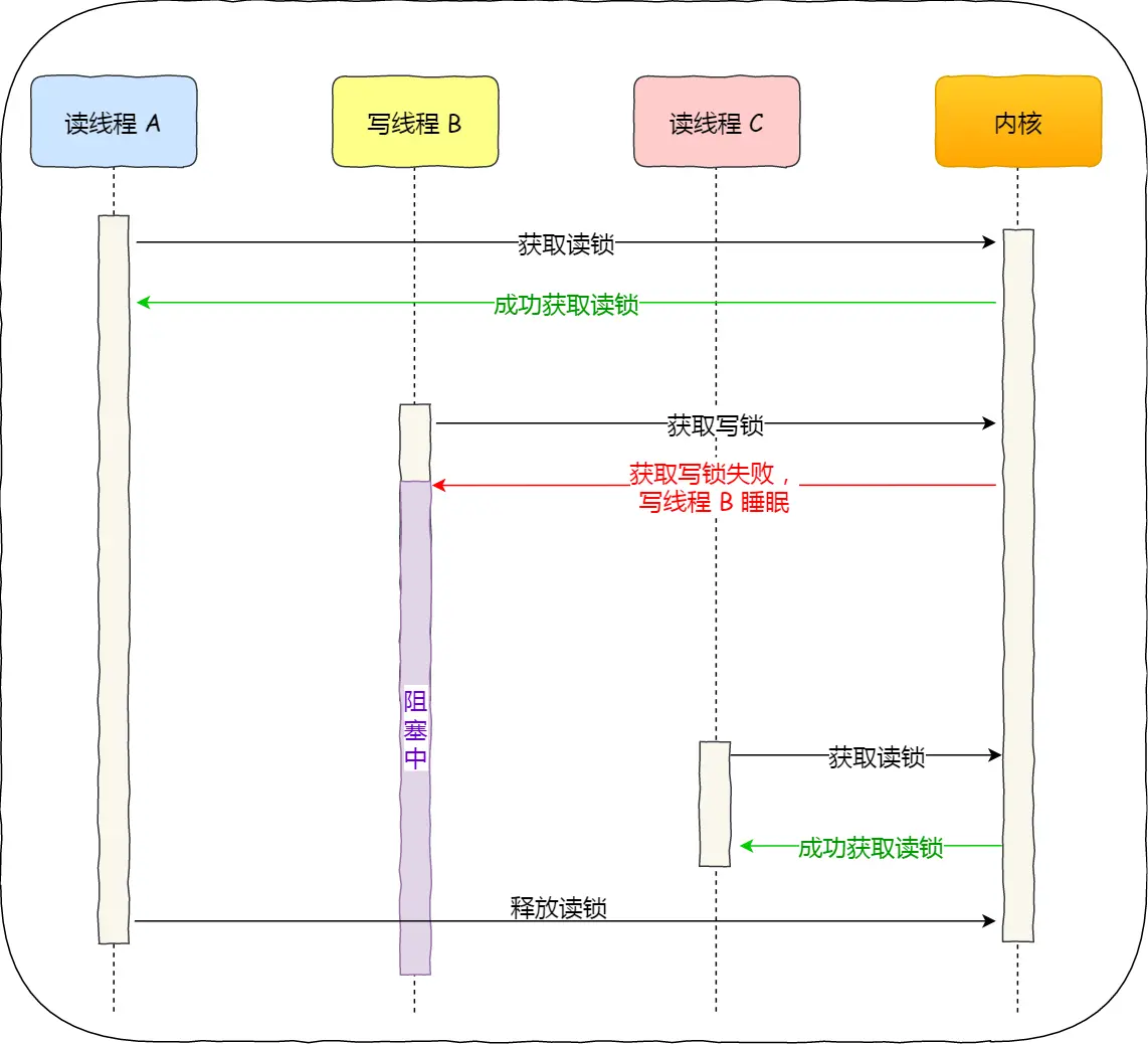 而「写优先锁」是优先服务写线程,其工作方式是:当读线程 A 先持有了读锁,写线程 B 在获取写锁的时候,会被阻塞,并且在阻塞过程中,后续来的读线程 C 获取读锁时会失败,于是读线程 C 将被阻塞在获取读锁的操作,这样只要读线程 A 释放读锁后,写线程 B 就可以成功获取写锁。如下图: