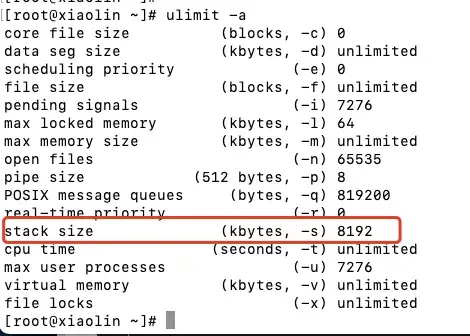 我们可以执行 ulimit -a 这条命令,查看进程创建线程时默认分配的栈空间大小,比如我这台服务器默认分配给线程的栈空间大小为 8M。
