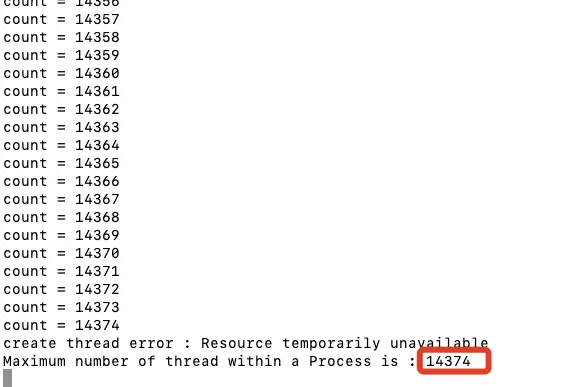 echo 99999 > /proc/sys/kernel/threads-max设置完 threads-max 参数后,我们重新跑测试线程数的程序,运行后结果如下图: