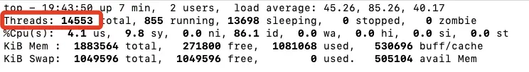 左上角的 Threads 的数量显示是 14553,与 threads-max 内核参数的值相同,所以我们可以认为是因为这个参数导致无法继续创建线程。