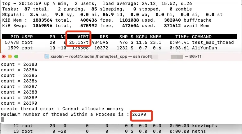 总共创建了 26390 个线程,然后就无法继续创建了,而且该进程的虚拟内存空间已经高达 25T,要知道这台服务器的物理内存才 2G。