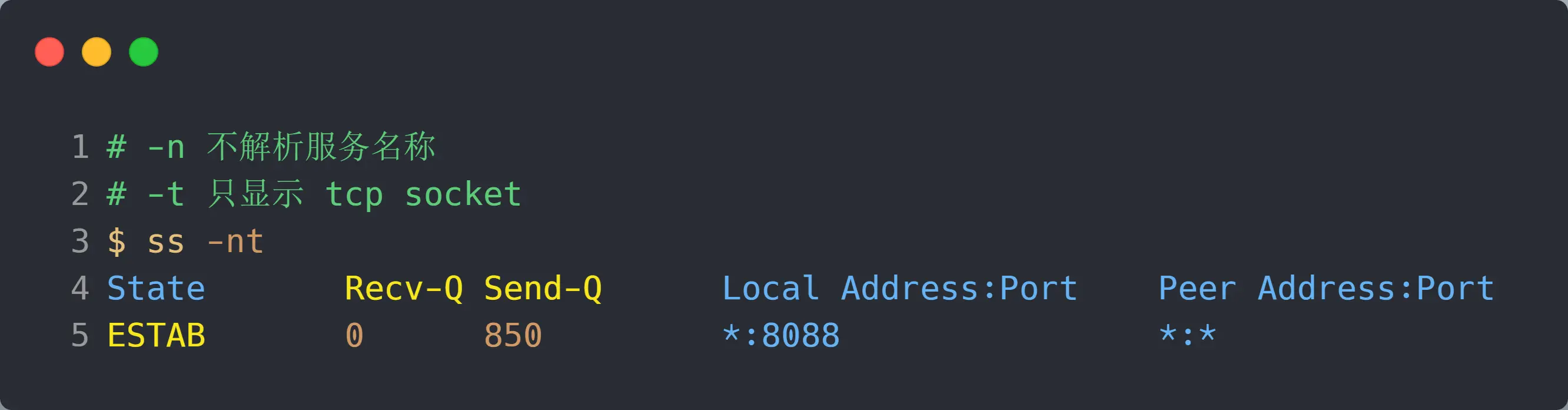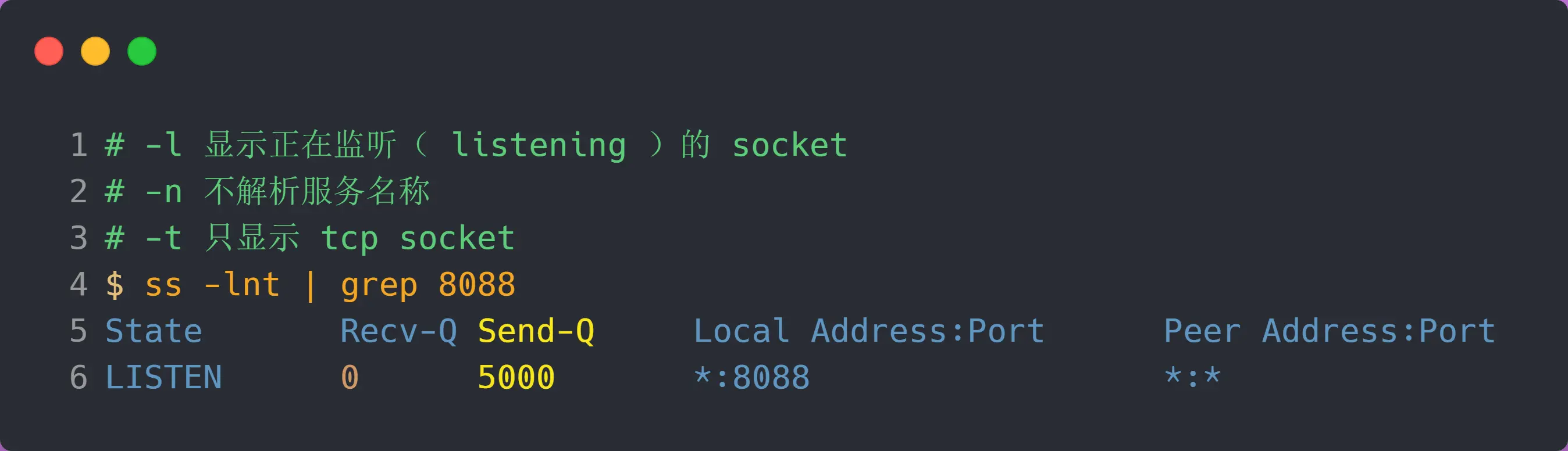 • Send-Q:当前全连接最大队列长度,上面的输出结果说明监听 8088 端口的 TCP 服务,最大全连接长度为 128;