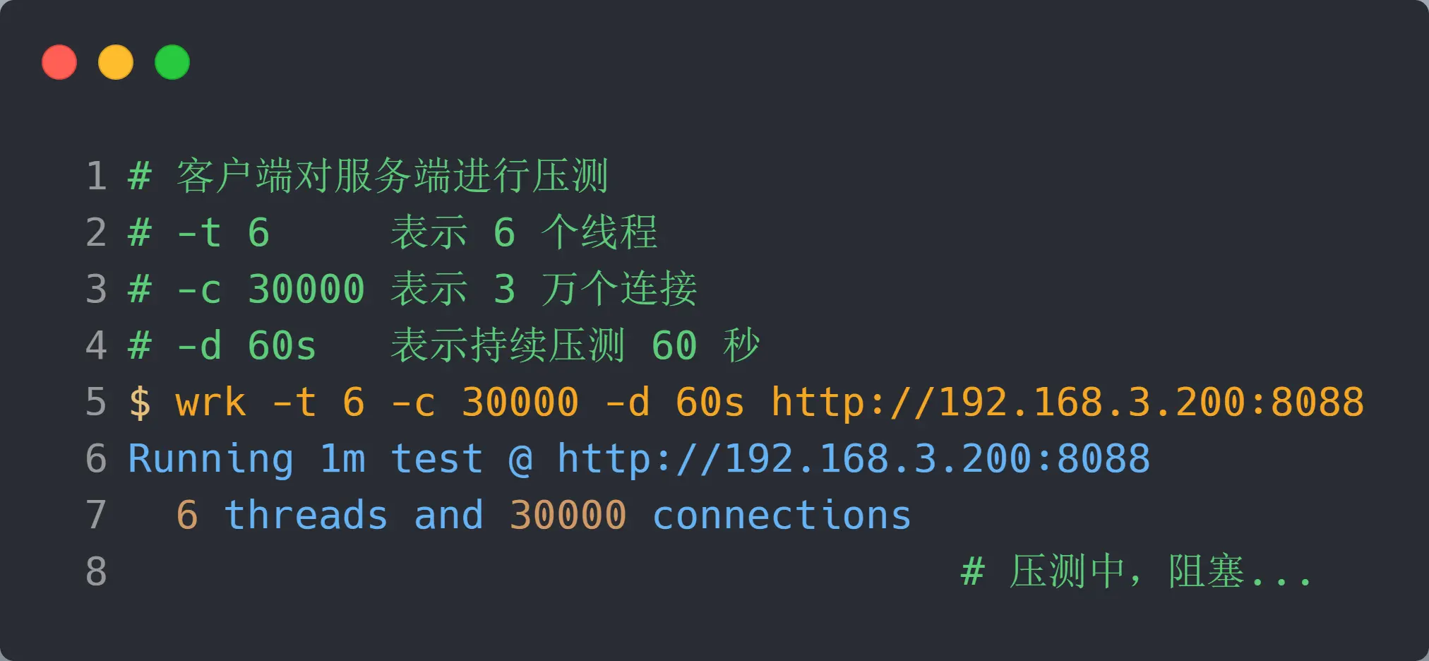 本次模拟实验就使用 wrk 工具来压力测试服务端,发起大量的请求,一起看看服务端 TCP 全连接队列满了会发生什么?有什么观察指标?