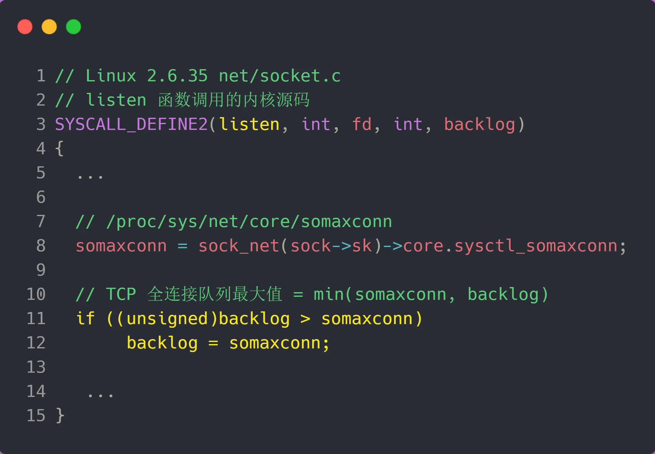 • 连接队列的最大值是 sk_max_ack_backlog 变量,sk_max_ack_backlog 实际上是在 listen() 源码里指定的,也就是 min(somaxconn, backlog)