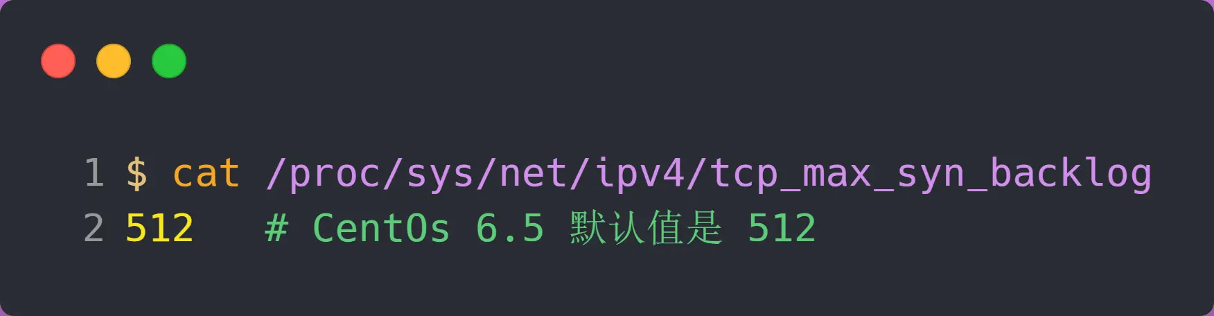 上面模拟 SYN 攻击场景时,服务端的 tcp_max_syn_backlog 的默认值如下: