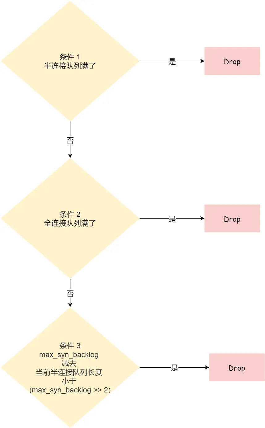 在前面我们在分析 TCP 第一次握手(收到 SYN 包)时会被丢弃的三种条件: