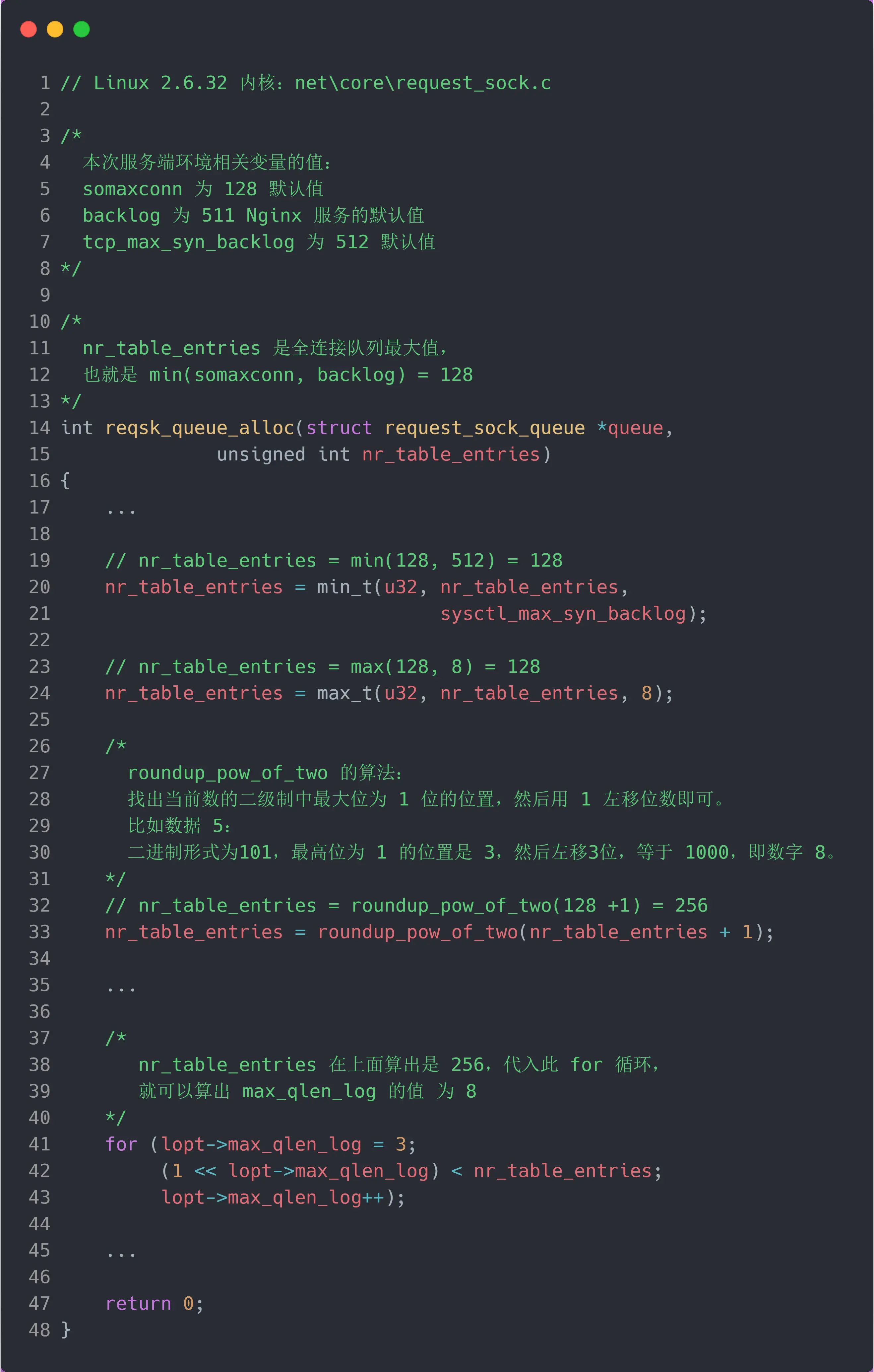 接下来,走进 Linux 内核的源码,来分析 TCP 半连接队列的最大值是如何决定的。