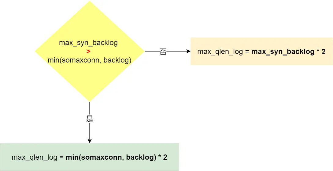 • 当 max_syn_backlog < min(somaxconn, backlog) 时, 半连接队列最大值 max_qlen_log = max_syn_backlog * 2;