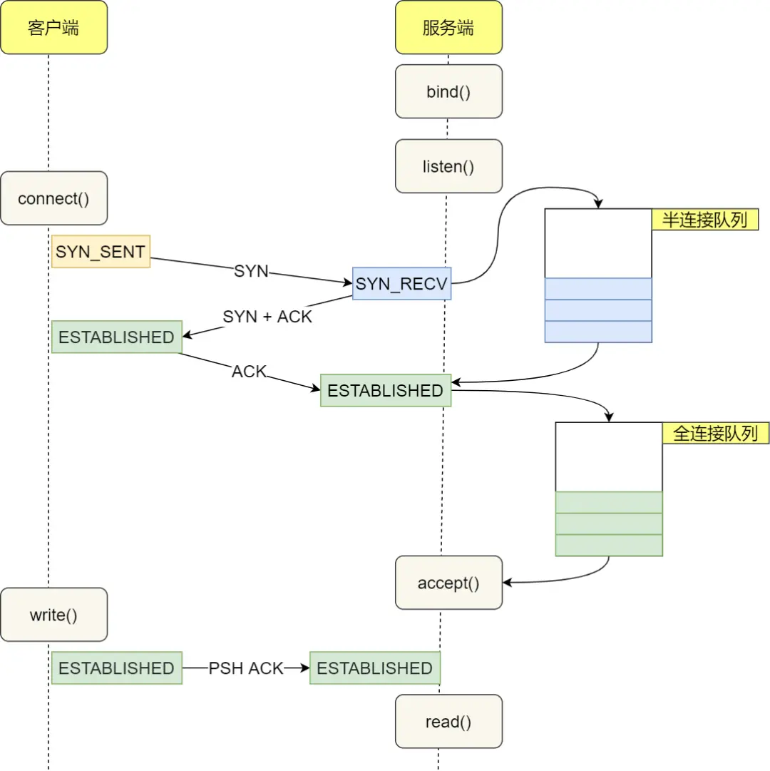 服务端收到客户端发起的 SYN 请求后,内核会把该连接存储到半连接队列 ,并向客户端响应 SYN+ACK,接着客户端会返回 ACK,服务端收到第三次握手的 ACK 后,内核会把连接从半连接队列移除,然后创建新的完全的连接,并将其添加到 accept 队列,等待进程调用 accept 函数时把连接取出来。