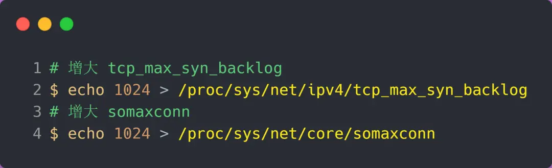 增大 tcp_max_syn_backlog 和 somaxconn 的方法是修改 Linux 内核参数: