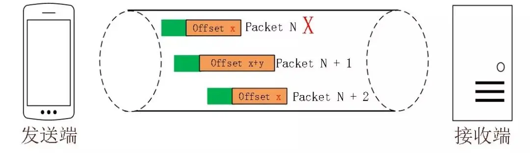 举个例子,下图中,数据包 Packet N 丢失了,后面重传该数据包的编号为 Packet N+2,丢失的数据包和重传的数据包 Stream ID 与 Offset 都一致,说明这两个数据包的内容一致 。这些数据包传输到接收端后,接收端能根据 Stream ID 与 Offset 字段信息将 Stream x 和 Stream x+y 按照顺序组织起来,然后交给应用程序处理。