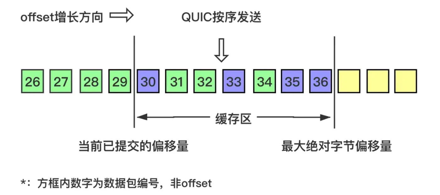 如图所示,当前发送方的缓冲区大小为8,发送方 QUIC 按序(offset顺序)发送 29-36 的数据包: