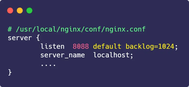 增大 backlog 的方式,每个 Web 服务都不同,比如 Nginx 增大 backlog 的方法如下: