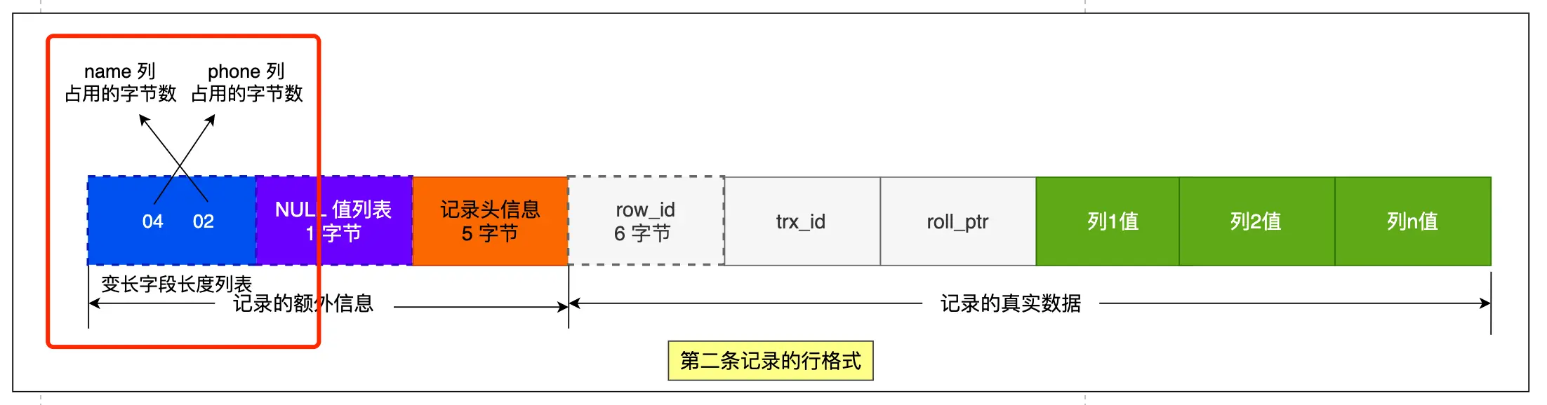可以看到,一条完整的记录分为「记录的额外信息」和「记录的真实数据」两个部分。