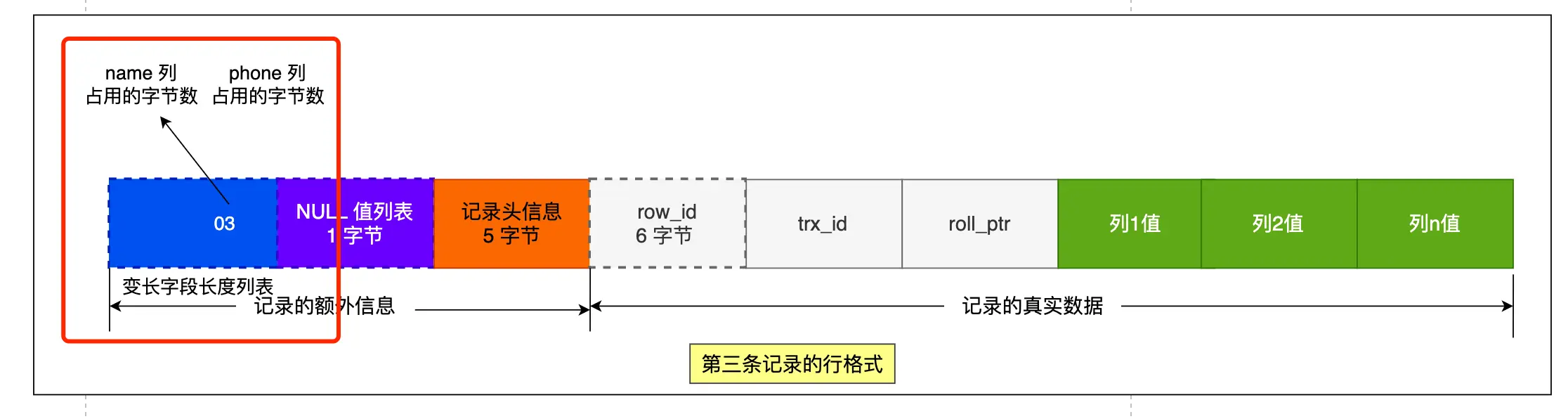 第三条记录 中 phone 列的值是 NULL,NULL 是不会存放在行格式中记录的真实数据部分里的 ,所以「变长字段长度列表」里不需要保存值为 NULL 的变长字段的长度。