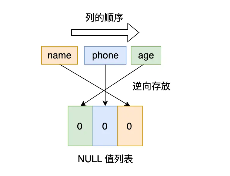同样的道理, NULL 值列表的信息也需要逆序存放。