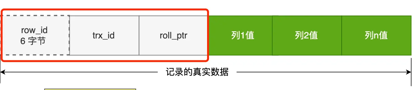 记录真实数据部分除了我们定义的字段,还有三个隐藏字段,分别为:row_id、trx_id、roll_pointer,我们来看下这三个字段是什么。