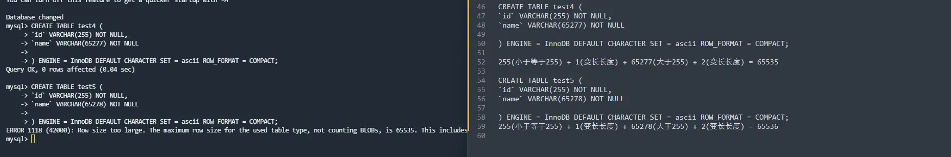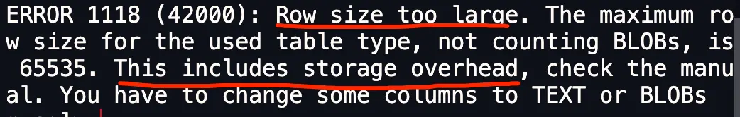 从报错信息就可以知道一行数据的最大字节数是 65535(不包含 TEXT、BLOBs 这种大对象类型),其中包含了 storage overhead