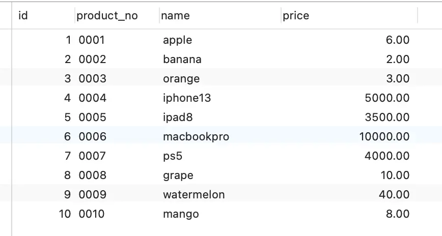 ) CHARACTER SET = utf8 COLLATE = utf8_general_ci ROW_FORMAT = Dynamic;商品表里,有这些行数据: