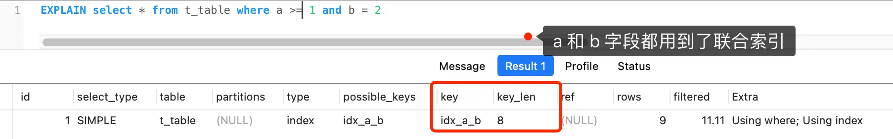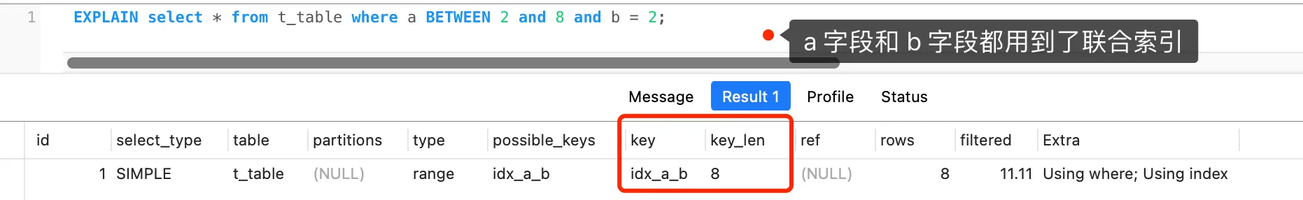 - key 字段表示实际用的索引,如果这一项为 NULL,说明没有使用索引;