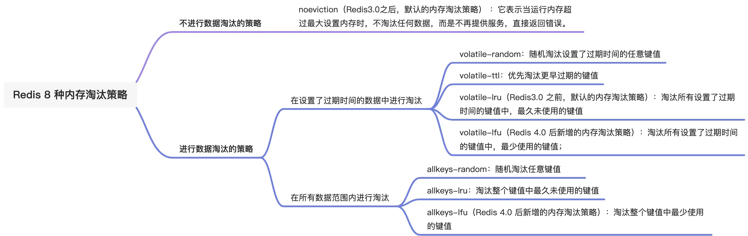内存淘汰策略是解决内存过大的问题,当 Redis 的运行内存超过最大运行内存时,就会触发内存淘汰策略,Redis 4.0 之后共实现了 8 种内存淘汰策略,我也对这 8 种的策略进行分类,如下: