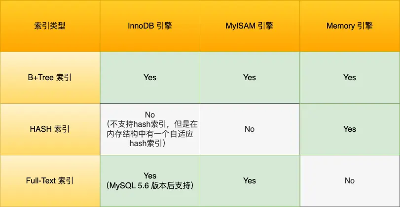 每一种存储引擎支持的索引类型不一定相同,我在表中总结了 MySQL 常见的存储引擎 InnoDB、MyISAM 和 Memory 分别支持的索引类型。