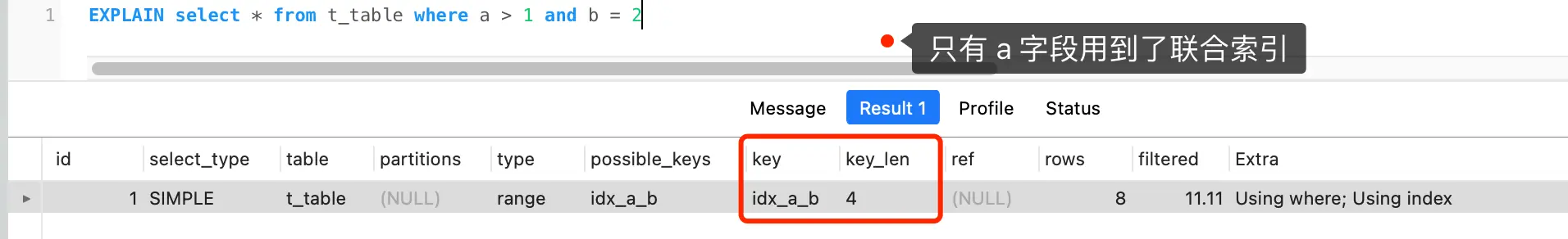 - key 字段表示实际用的索引,如果这一项为 NULL,说明没有使用索引;