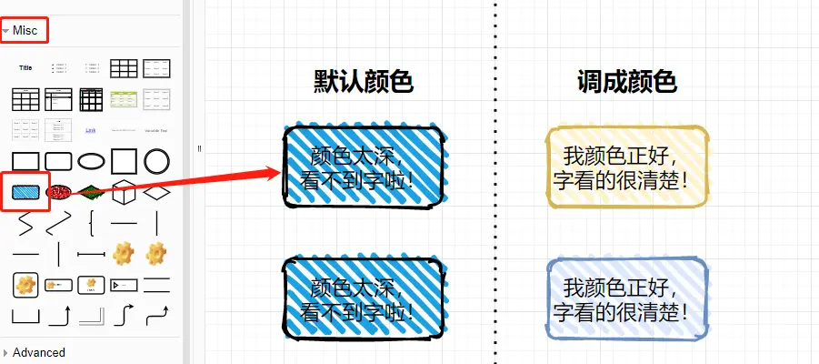 我最近常用的一个图形是圆角方块图,它的位置如下图,但是它默认的颜色过于深色,如果要在方框图中描述文字,则可能看不清楚,这时我会在最右侧的「属性设置区域」把方块颜色设置成浅色系列的。另外,还有一点需要注意的是,默认的字体大小比较小,我一般会调成 16px 大小。
