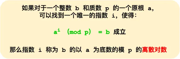 上图的,底数 a 和模数 p 是离散对数的公共参数,也就说是公开的,b 是真数,i 是对数。知道了对数,就可以用上面的公式计算出真数。但反过来,知道真数却很难推算出对数。