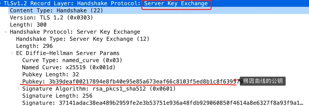 这一步就和 RSA 握手过程有很大的区别了,因为服务端选择了 ECDHE 密钥协商算法,所以会在发送完证书后,发送「Server Key Exchange 」消息。