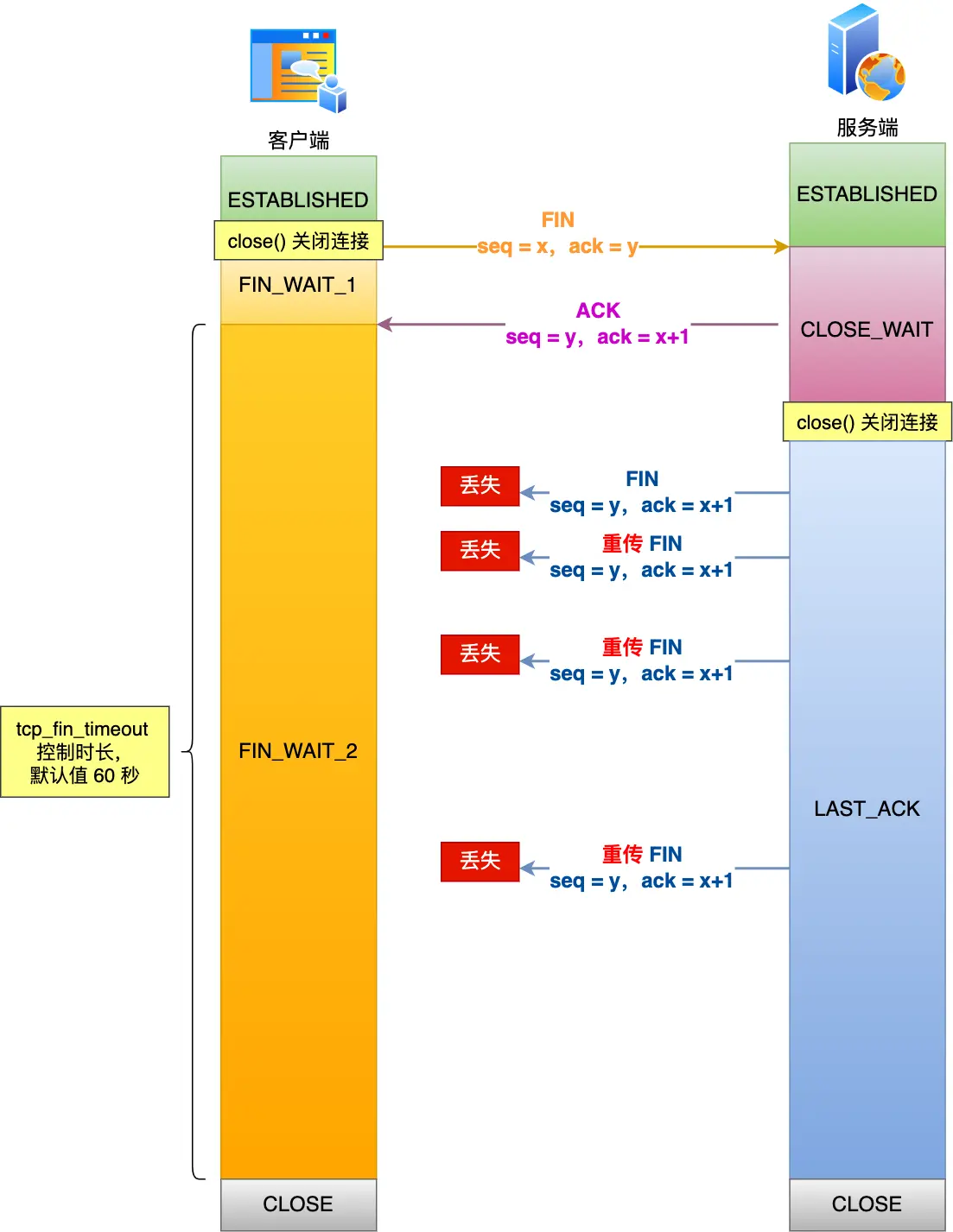 CLOSE_WAIT 状态是「被动关闭方」才会有的状态,而且如果「被动关闭方」没有调用 close 函数关闭连接,那么就无法发出 FIN 报文,从而无法使得 CLOSE_WAIT 状态的连接转变为 LAST_ACK 状态。