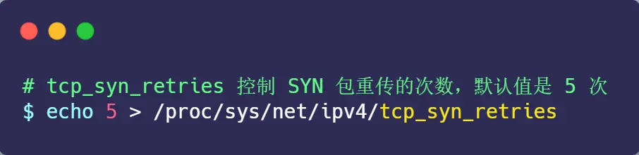 你可以根据网络的稳定性和目标服务器的繁忙程度修改 SYN 的重传次数,调整客户端的三次握手时间上限。比如内网中通讯时,就可以适当调低重试次数,尽快把错误暴露给应用程序。