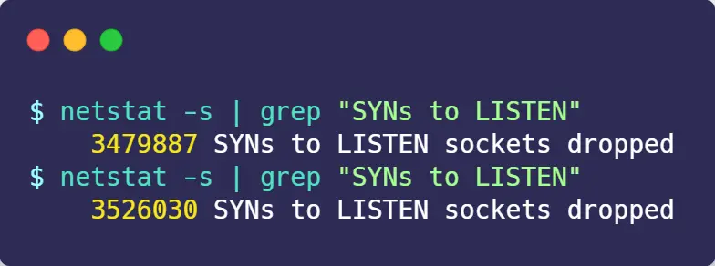 我们可以通过该 netstat -s 命令给出的统计结果中, 可以得到由于半连接队列已满,引发的失败次数: