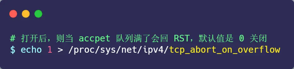 所以,tcp_abort_on_overflow 设为 0 可以提高连接建立的成功率,只有你非常肯定 TCP 全连接队列会长期溢出时,才能设置为 1 以尽快通知客户端。