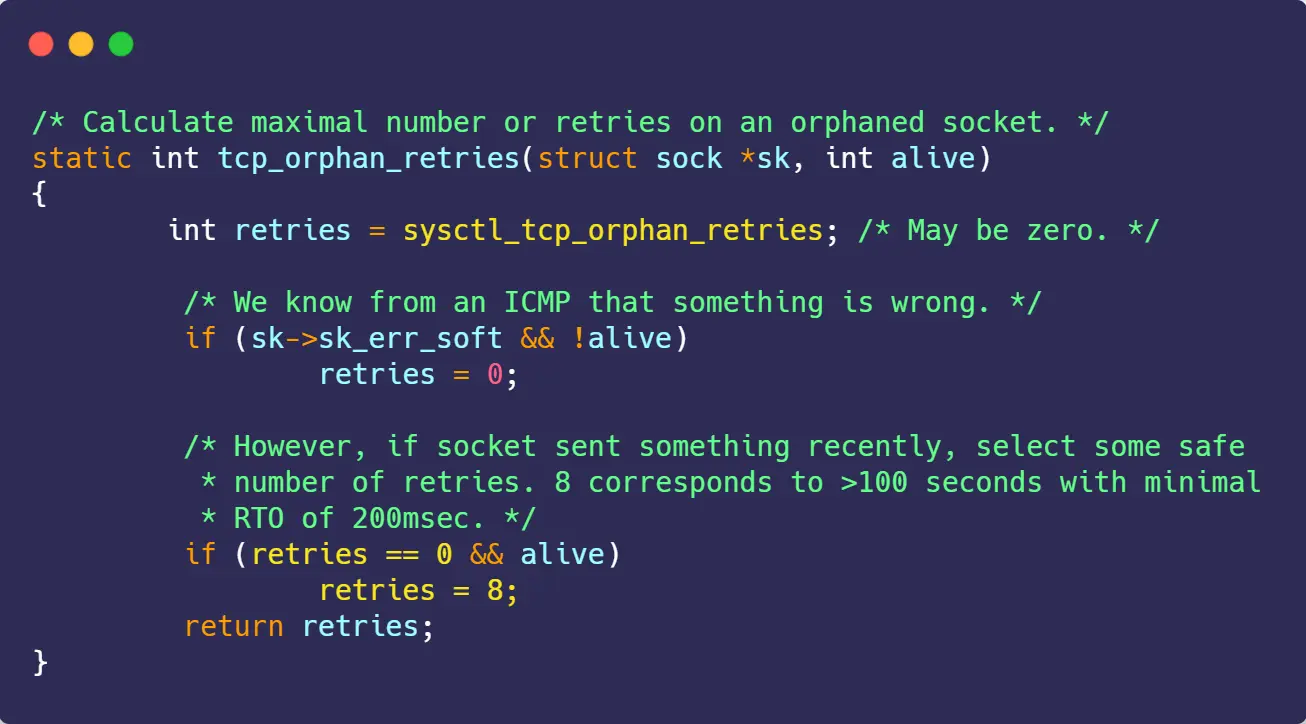 tcp_fin_timeout秒内没有收到对方的 FIN 报文,连接就直接关闭。同时,为了应对孤儿连接占用太多的资源,tcp_max_orphans定义了最大孤儿连接的数量,超过时连接就会直接释放。 - 反之是 shutdown 函数关闭的连接,则不受此参数限制;